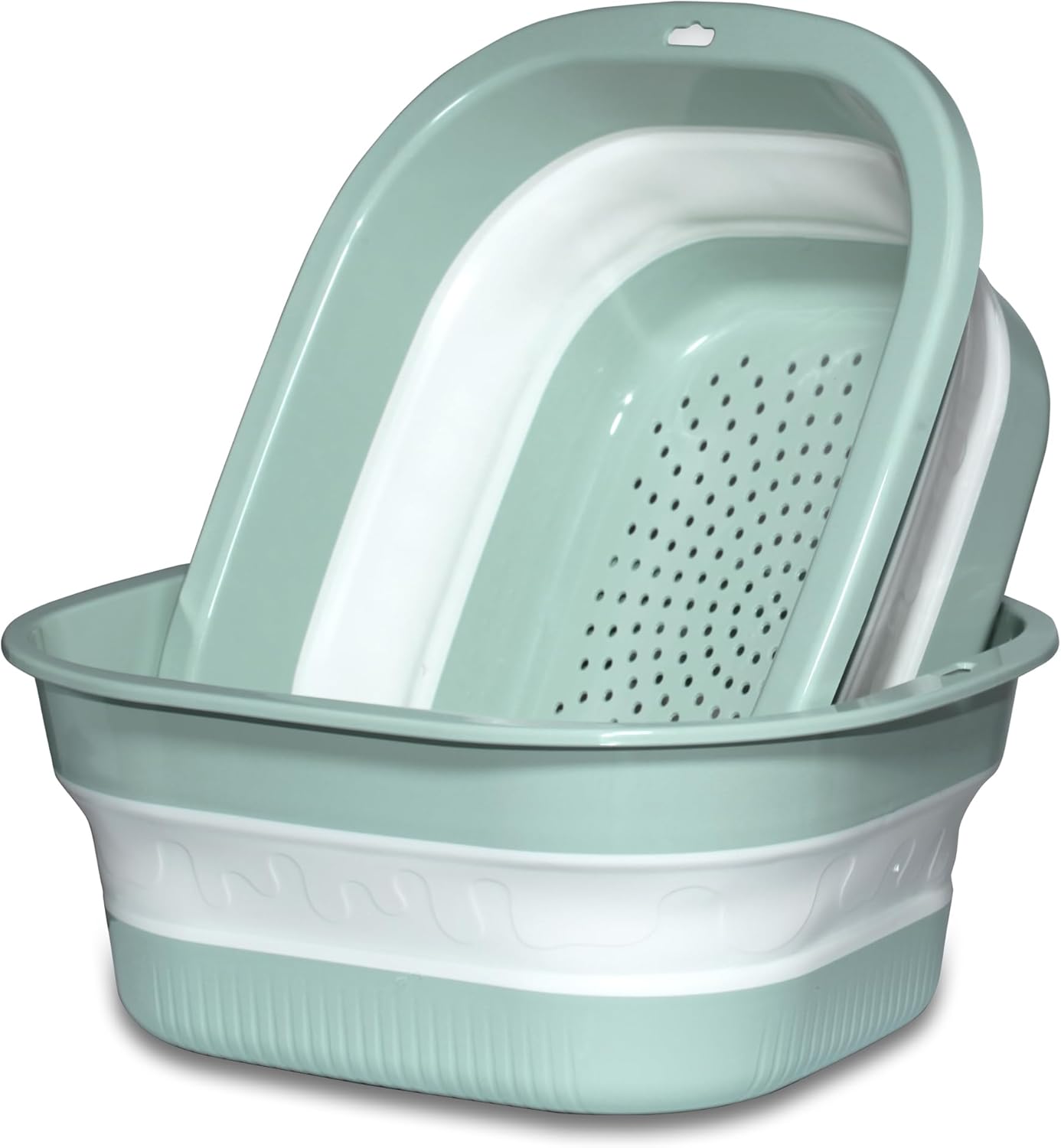- 【2-IN-1 DESIGN】 – This collapsible colander and basin set features a dual-layer design. The upper drain basket allows quick rinsing, while the lower basin collects water for reuse or soaking. Perfect for washing vegetables, fruits, and pasta.